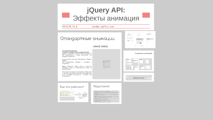 jQuery эффекты | jQuery справочник В этом разделе сайта вы найдете для себя все методы для создания и добавления анимации, и сложных пользовательских эффектов на Ваши веб-страницы с использованием библиотеки jQuery. МетодОписание .animate()Выполняет пользовательскую анимацию основанную на изменении CSS свойств для выбранных элементов. .clearQueue()По порядку удаляет из очереди все функции, которые еще не были выполнены. […]