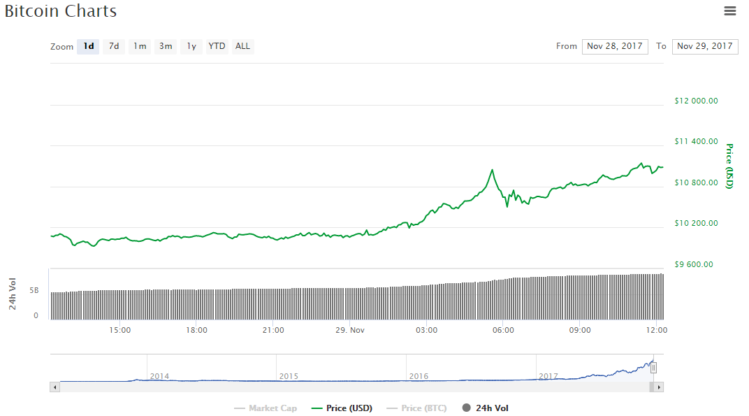 После достижения исторического максимума в $11 388 курс биткоина начал резко снижаться, всего за несколько часов опустившись ниже отметки в $9 000.