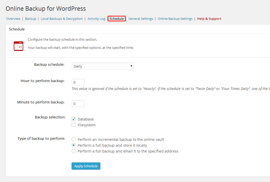 Плагин позволяет планировать ежедневное, еженедельное и ежемесячное резервное копирование. И вы можете отправить себе резервную копию по электронной почте и / или сохранить ее в облачных хранилищах, таких как Dropbox, Amazon S3, Rackspace Cloud, FTP и Stash (их облачный сервис). Если вы решите использовать их сервис, они поддерживают резервное копирование в реальном времени.